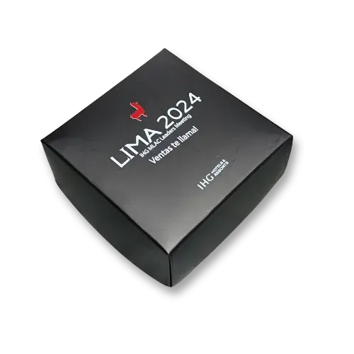 Elegantes cajas negras personalizables con stickers metalizados o en vinilo.